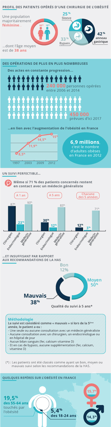 Considérant qu’un “bon” suivi correspond à plus d’un rendez-vous par an avec un médecin généraliste, au moins un rendez-vous par an avec un chirurgien ou un endocrinologue et au moins un bilan sanguin, seuls 12 % des opérés bénéficient d’un suivi optimal au regard des recommandation de la Haute Autorité de Santé.